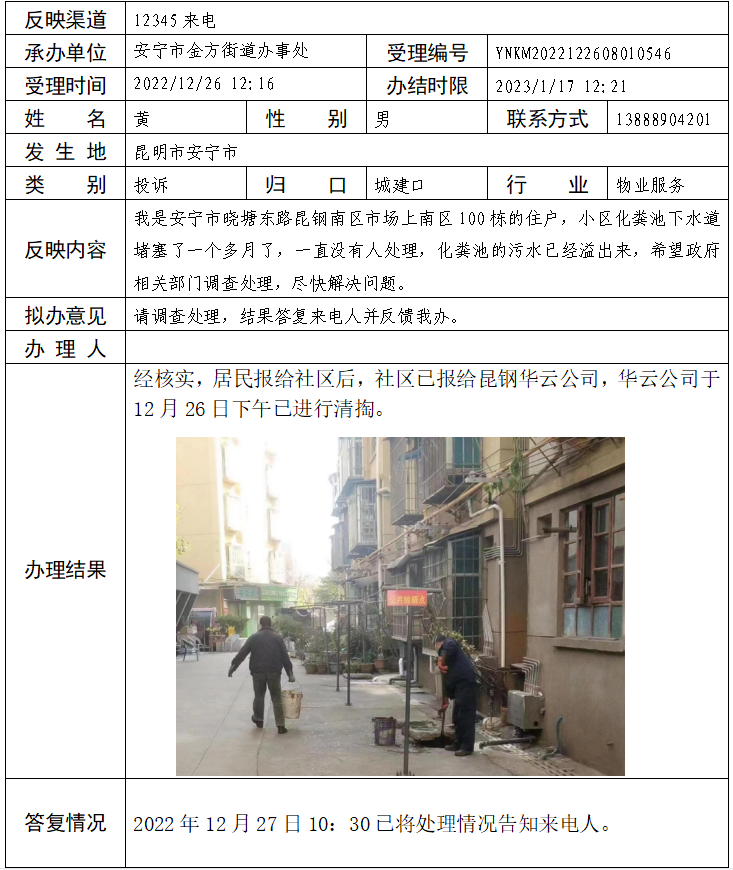 金方街道办事处关于12345市长热线交办单YNKM2022122608010546号的答复
